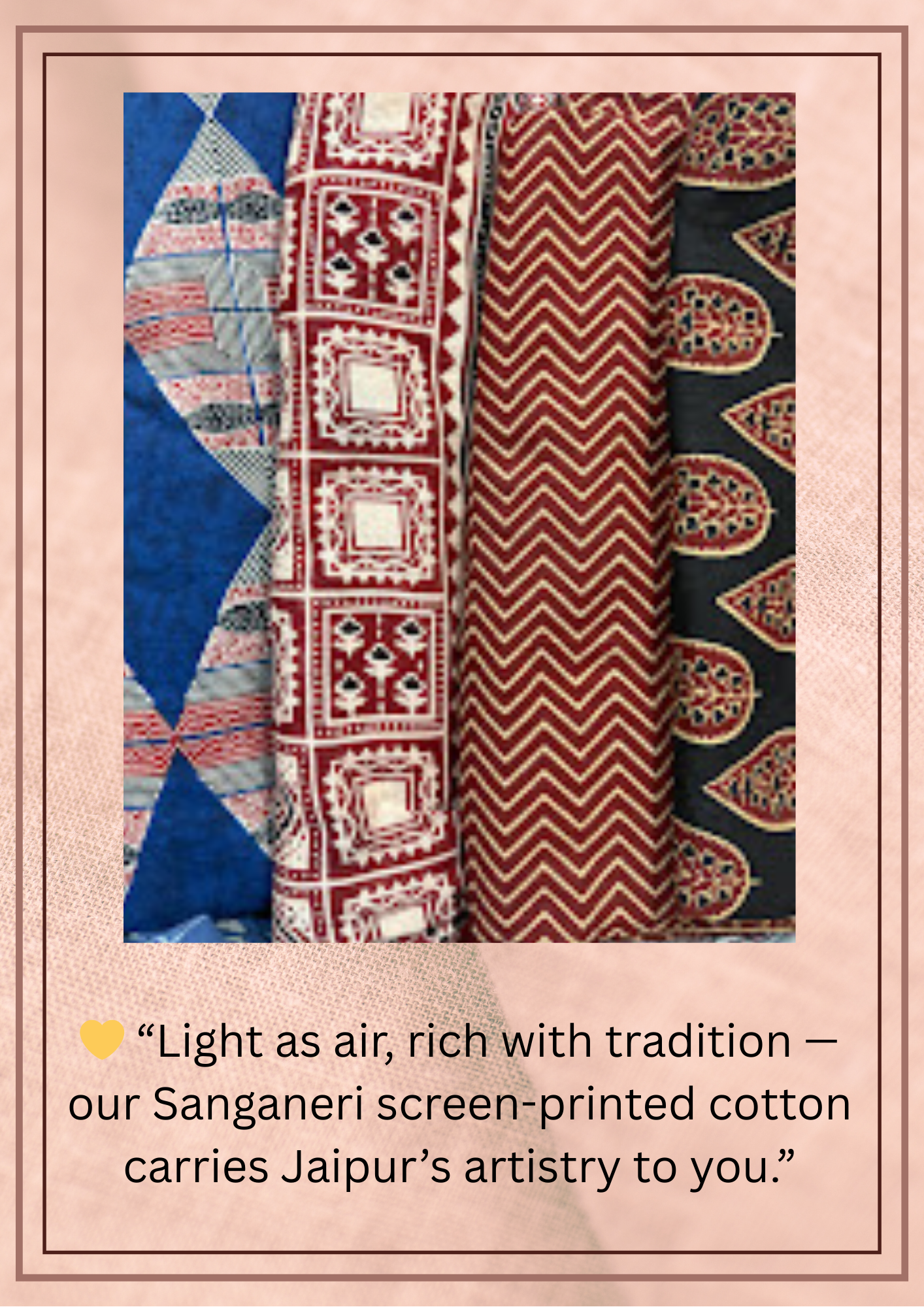 “Heritage from Sanganer meets soft organic cotton — screen-printed motifs that honour centuries of craft while caring for your skin and the planet.”