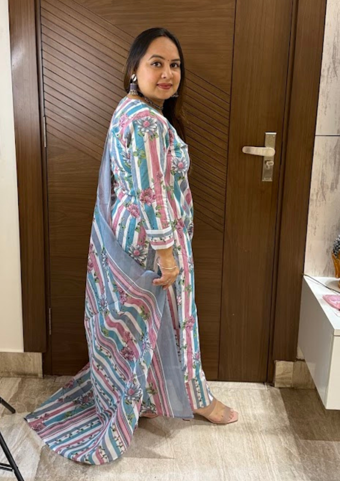 Sia Pastel Pink & Blue Cotton Floral Print Suit Set with Dupatta and Pant